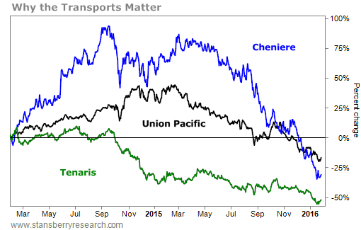 Tenaris (TS), whose steel pipes are designed to facilitate oil recovery from offshore rigs, is down 54%. Union Pacific (UNP), whose rail cars were recently packed with oil coming from shale fields and whose shares soared on that demand, is now down 18%. And a personal favorite, Cheniere Energy (LNG) – whose balance sheet is stuffed with debt and whose facilities are designed to transport expensive, liquefied natural gas – is down 31%. These firms represent the first domino along a much longer chain. And that's why the Dow Jones Transportation Average has been such a valuable leading indicator of this bear market.