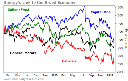 Likewise, a lot of the employees of the greater energy/transportation complex have a credit card or a car loan with Capital One Financial (COF). Losses are mounting there too and its shares are down 8.5% over the last two years. Finally... what do all of these oil workers drive? A truck, of course. And who makes most of the trucks in the U.S.? General Motors (GM), whose shares are down almost 20% over the last two years.