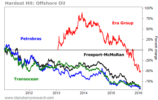 The first and most obvious impact of new, cheaper supplies of oil is that other, higher cost forms of oil have suffered. Not widely discussed has been the complete destruction of the entire offshore U.S. oil industry. Resource giant Freeport-McMoRan (FCX) – which had invested tens of billions of dollars in offshore assets and drilling – announced last week that it's halting all of its Gulf of Mexico exploration. Its stock is now down 91% over the last five years. Likewise, Brazil's state-owned Petrobras (PBR), whose primary oil assets are in the deep (sub-salt) waters of Brazil, has fallen 91%.