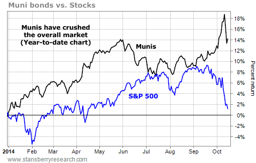 We hope you listened. One of Retirement Millionaire editor Dr. David "Doc" Eifrig's favorite muni-bond funds is up nearly 1.5% today. While the rest of the market has sold off, munis have soared. Just take a look at this chart...