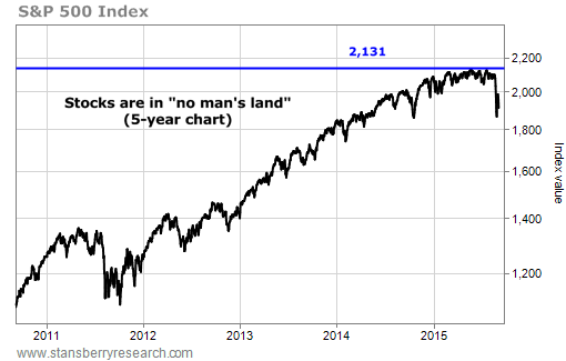But keep in mind... the market has advanced for six consecutive years. It's richly priced. For these reasons, a rally off the 1,702 level is just as likely to fizzle out and then turn lower as it is to soar past 2,131. By waiting for the market to break 2,131, you'll avoid the frustration of trying to constantly pick bottoms in what could be a long-term bear market.