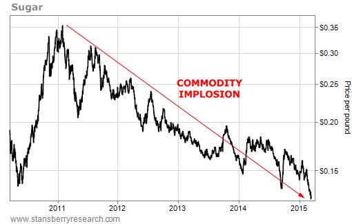 Sugar prices are also hitting a five-year low on fears in Brazil. The country is the world's largest producer of sugar, and its weakening currency (the real) could spur a flood of supply. Brazilian producers can flood the market with sugar and collect strong dollars...