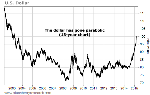 The U.S. dollar is at its highest level since 2003. The world's reserve currency has appreciated 25% since July 1 – an insane move for a major currency.