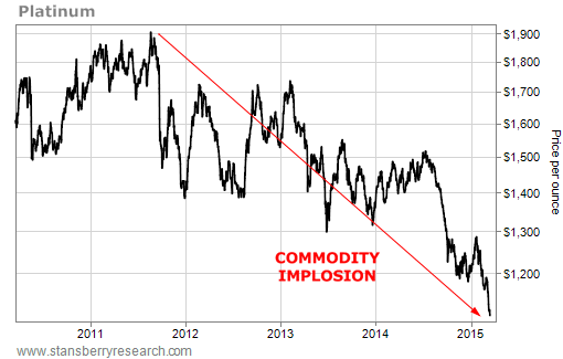 Platinum is also trading at a five-year low. The precious metal traded at a high of $1,884.80 an ounce on September 2, 2011. It trades for less than $1,100 an ounce today – a fall of more than 40%...