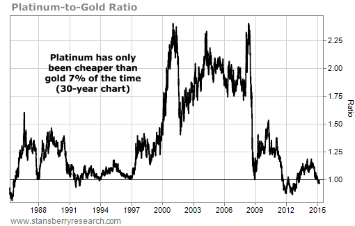 And today, we're seeing something rare in platinum... It's trading for less than the spot price of gold (which currently sits at $1,154 an ounce).