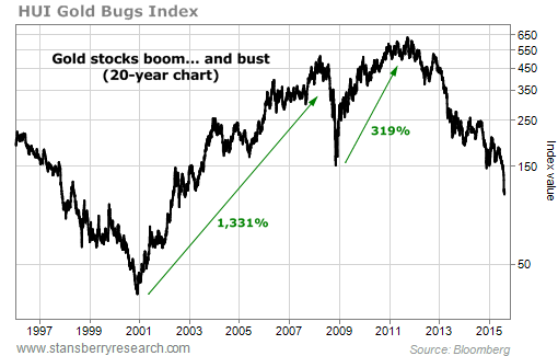 The chart below shows how powerful this idea can be. It displays the past 15 years of the most widely used gold-stock index (the "HUI").