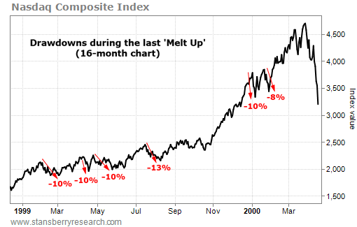 Just look at a chart of the Nasdaq from late 1998 through mid-April 2000. During the final 15 months of the last Melt Up, the Nasdaq soared 146%... But it also dropped 8% or more, six times...