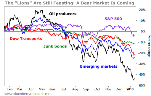 The oil drillers and the U.S. high-yield market broke down to new lows way back on December 7. We warned you specifically that this was terrible news for stocks. Sure enough, a month later, on January 6, emerging markets and the Dow Jones Transportation Index broke to new lows. The Dow Jones Industrial Average and the S&P 500 Index haven't fallen that far yet... but they will.