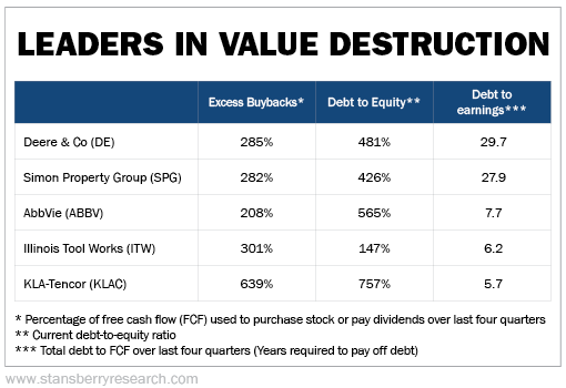 Below, you will find a chart showing five companies whose debt-funded buybacks over the past year go so far beyond merely stupid that their actions cry out for an investigation of the management team (and a complete replacement of their boards).