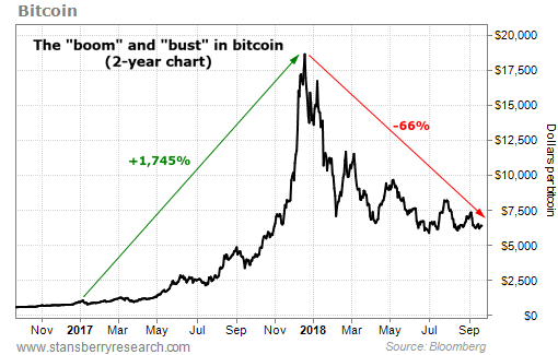 Parabolic rallies are typically followed by huge declines of 50%... 80%... or more. That's exactly what's happened to bitcoin and other "cryptos" over the past several months. And we expect pot stocks will eventually suffer a similar fate.