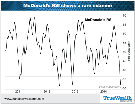 As Steve Sjuggerud pointed out last week in the August 20 edition of True Wealth Systems' Review of Market Extremes, McDonald's is oversold right now, according to its relative strength index (RSI).