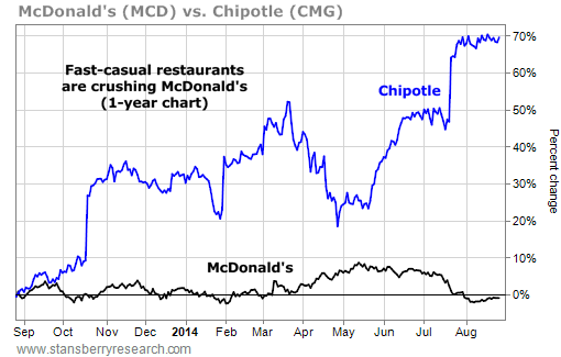 Plus, as our "disappearing middle class" thesis continues to play out, McDonald's should regain its popularity... $10 lunches at Chipotle are great when you can afford them. But when things get tight, McDonald's Dollar Menu looks more and more attractive.