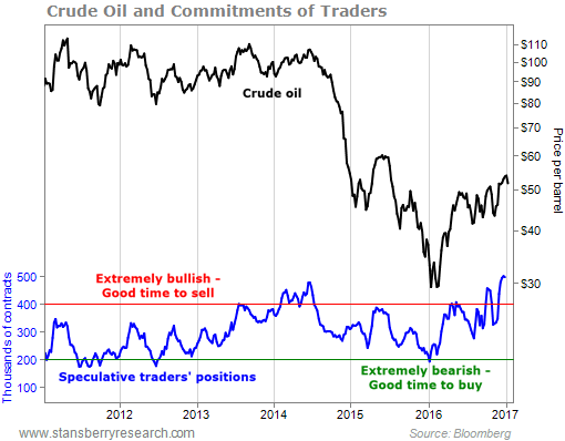 Last year, we issued two oil warnings based on similar sentiment extremes. After our June 23 warning, oil prices fell nearly $10 per barrel, a 20% drop. After our October 24 warning, oil prices fell nearly $9 a barrel, a 17% drop.