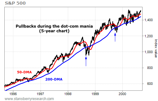 In the chart below, you can see that the S&P 500 fell below its 50-DMA during each of the pullbacks in the last Melt Up. But it held above its 200-DMA most of the time, except in 1998 and 1999 (the blue arrows).