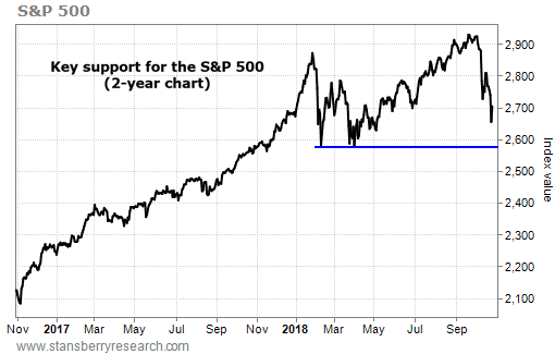 If stocks fall and hold below 2,580, we need to be more cautious. Volatility will likely jump in that environment. And it could be a sign that we're in for a bigger decline like in 1998.