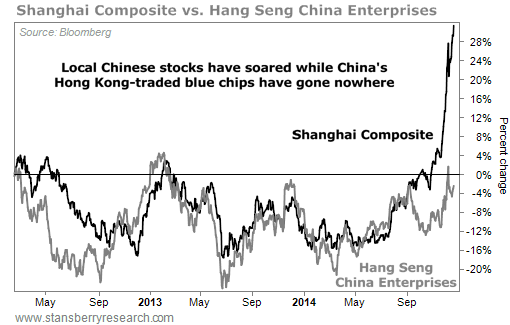 In the January issue of True Wealth, Steve told subscribers how to buy the largest Chinese blue chips (companies like mobile-phone provider China Mobile, which has 800 million customers) for a fraction of their value on the Shanghai Stock Exchange. You just had to buy shares on the Hong Kong Stock Exchange.