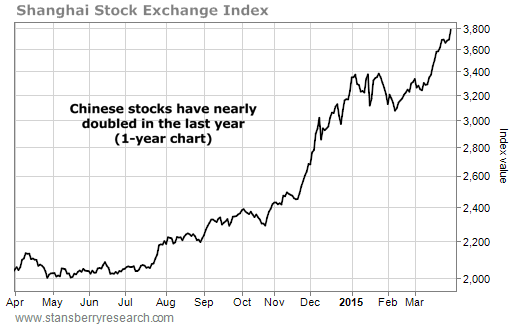 Two weeks ago, we noted that the Shanghai Composite Index hit a seven-year high. Today, the Shanghai Composite Index closed at nearly 3,790. Chinese stocks are up more than 3.3% since mid-March... a huge move in just two weeks.