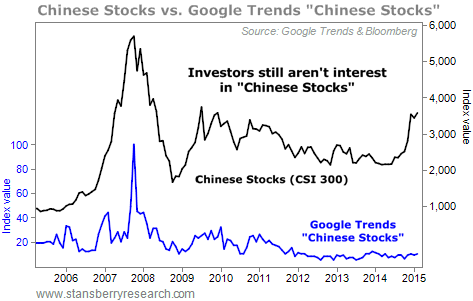 The simplest thing I can tell you is, when we are at a peak of greed (like bitcoin in 2013 and China in 2007) or a peak of fear (like the Global Financial Crisis of 2007-08), Google Trends search results often peak. One important thing to note today is the lack of interest in Chinese stocks by U.S. investors (as you can see in the chart above).