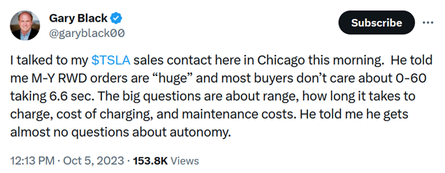 I'm looking at Troy's numbers: Q3 just reported: 86K, 2Q before that 92K, 1Q was 94K, 4Q 2022 was 95K. So basically down every single quarter in a row. This isn't growth. It's consistent decline. 95K -> 94K -> 92K -> 86K. Down every quarter, four in a row. And that is UNITS. Now imagine the catastrophic impact on the bottom line from all the wild price cuts, and the idle capacity in the Germany factory. This is more Enron than Elvis.