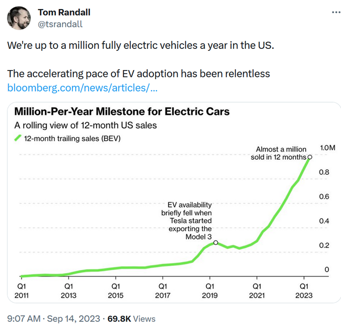 In early October Tesla is expected to report declining sequential deliveries vs. Q2 despite yet more continual worldwide margin-slashing price-cutting. In other words, Tesla is now just another low-margin car company forced to continually cut prices to try to juice its delivery volume, and its annualized earnings (in an industry with typical PE ratios of 4x to 8x) are now only around $3/share (a decline from 2022's figure), while its high-single-digit operating margin is down to roughly "industry-average." (As for Tesla's irrelevant "energy business," it accounts for only around 6% of revenue and likely has a net margin in just the mid-single digits.)