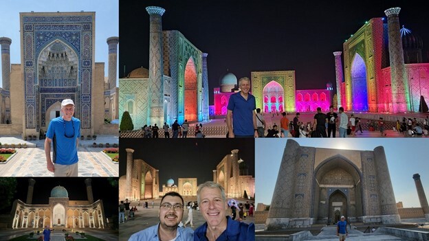 I posted these pictures plus 25 more on Facebook here, including a handful of old photos showing how the sites had fallen into disrepair during the Soviet era before they were beautifully and lovingly restored by Uzbekistan following its independence in 1991. The before-and-after pictures are astounding, as are the ones I took last night when we returned to the two most spectacular sites we visited during the day – Timur's mausoleum and Registan Square. (I'm really pleased with how the night pictures came out using my new Samsung S21 Ultra phone.)