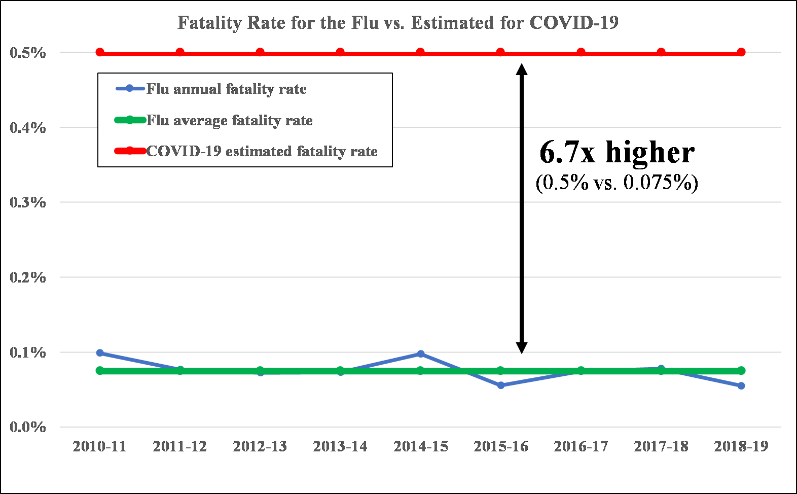 So, the actual number of people who get the flu is 5% to 20% of Americans each year, 67% to 82% higher than 3% to 11%. Taking the midpoint, that's 75% more. This drops the 0.131% to a 0.075% true (infection) fatality rate, meaning the true COVID-19 fatality rate is 6.7 times higher, as this chart shows: