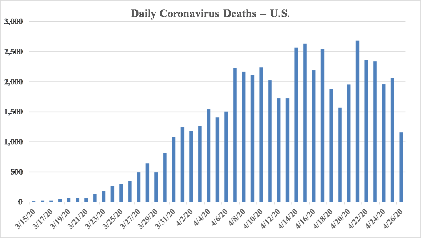 Let's hope yesterday's decline to "only" 1,157 deaths is the start of a downward trend. (Sundays appear to be lower than other days... But even so, here are the last three Sundays: 1,727, 1,570, and 1,157 – a very favorable trend.)