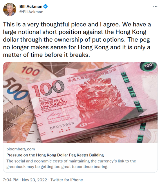 The media coverage has been harsh, with the Asia Times writing Bill Ackman's HK dollar play a certain losing bet and the Financial Times piling on (Bill Ackman, macro tourist, is back), with this funny graphic: