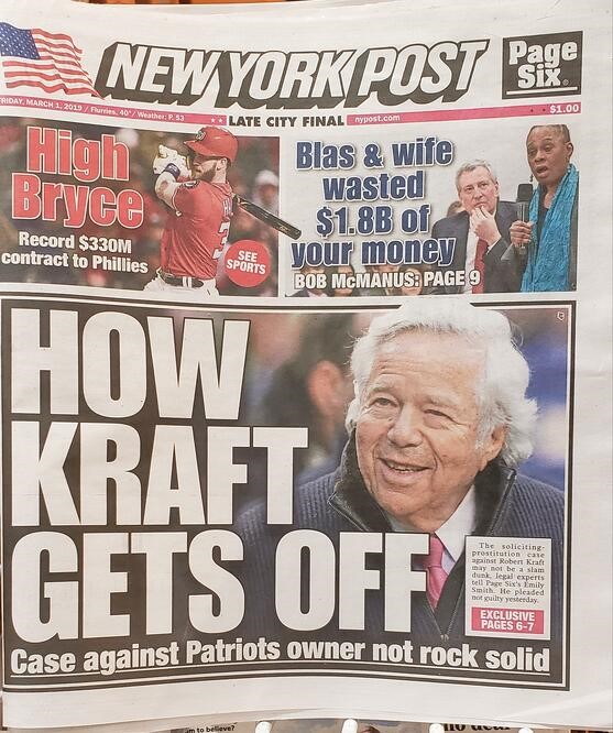 4. Following up on Tuesday's email about Robert Kraft and how "It takes a lifetime to build a reputation and five minutes to destroy it," the cover of today's NY Post killed me!