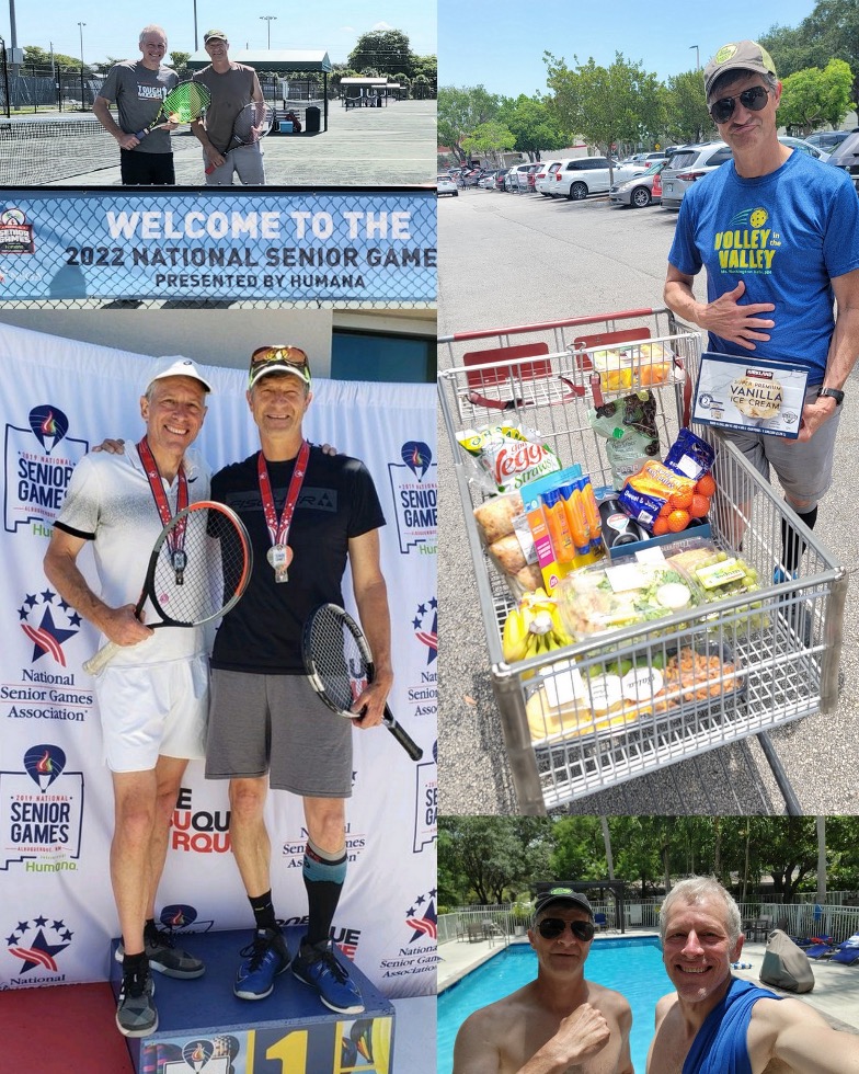 3) Greetings from Fort Lauderdale! I'm here for a few days, competing in the National Senior Games in singles and doubles tennis with my cousin Steve.