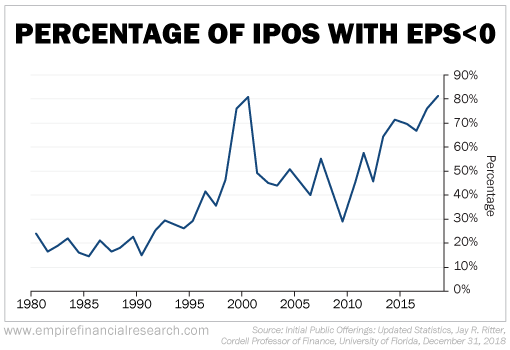 4) More evidence that we're in an IPO bubble: We're approaching the 2000 peak of the percentage of companies (nearly 90%!) that are going public while losing money:
