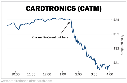 1) Wow. It speaks to the quality of Justin Hughes' presentation (and who's on this e-mail list) that the stock of ATM operator Cardtronics (CATM) dropped like a stone, falling more than 10%, shortly after my e-mail went out yesterday just after 1:30 p.m., as you can see in this intraday chart:
