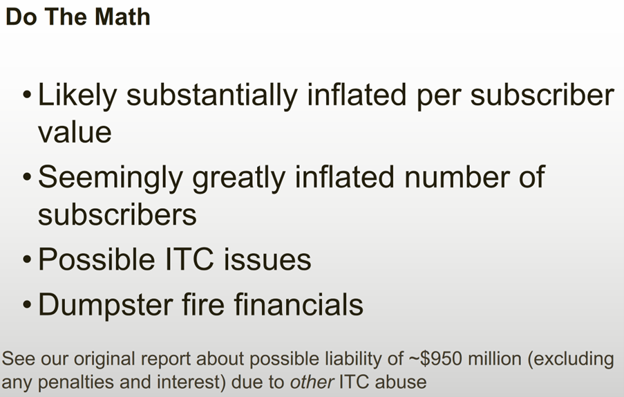 My friend, activist short seller Carson Block of Muddy Waters Research, laid out his short thesis on home solar company Sunrun (RUN) and then posted his presentation on his website here. Here was his final slide, summarizing his points: