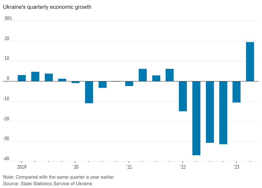 Losing long-term backing from its biggest financial supporter would derail a nascent economic rebound in the country. Activity expanded in the second quarter for the first time since the start of the war, after a devastating 29% contraction in 2022. Businesses and households have adapted to life during war, buying diesel generators to get through blackouts and moving to cities in western Ukraine.