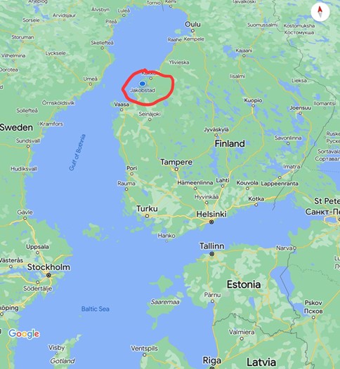 Here's a map of the area, with Jakobstad circled – we're going west and a little bit south today: