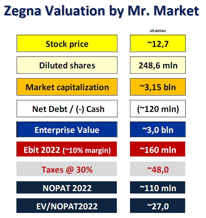 Being from Italy, Ciccio specializes in Italian companies, most of which trade on the Borsa Italiana exchange, but Zegna was particularly interesting to me because it trades on the New York Stock Exchange. It went public via a SPAC merger, which went through in December 2021. Since then, the stocks of most SPACs have cratered... but ZGN is actually up – closing yesterday at $13.59, giving it a $3.3 billion market cap.