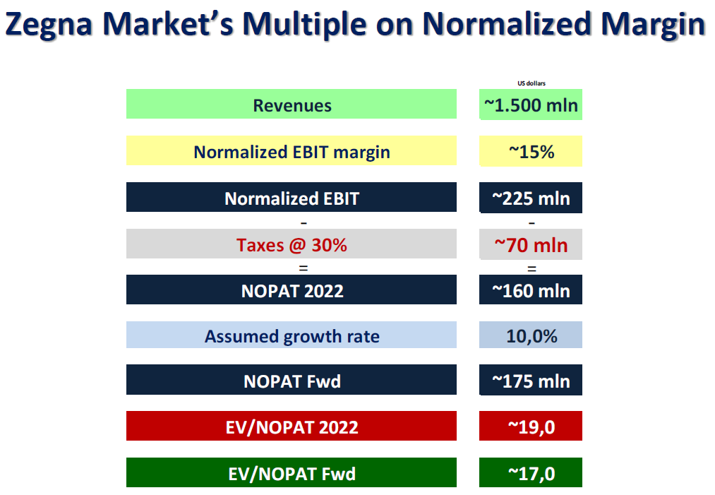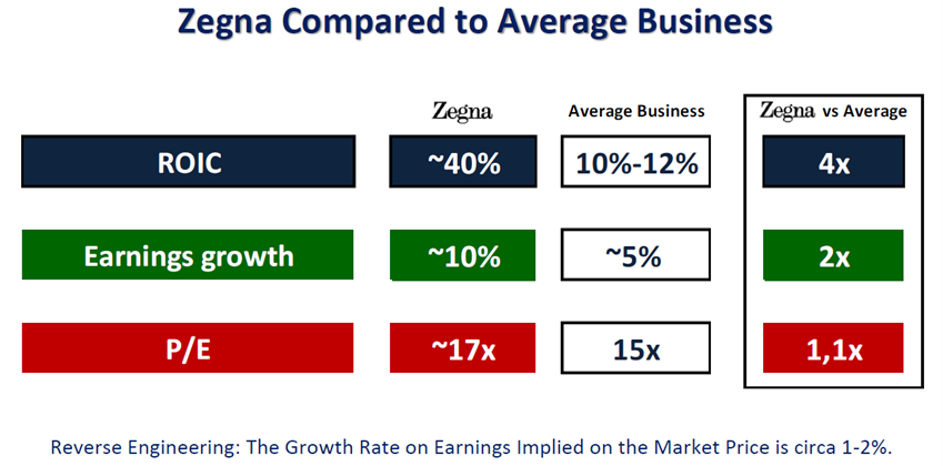 Ciccio began his presentation (which you can access right here) by showing a two-minute company video: Our Story. He then made a compelling case that Zegna is a very high-quality company with a moderately valued stock, using these four slides: