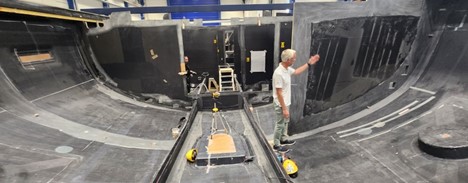 Then, the entire boat is transferred into an enormous room nearly the size of football field that's an oven that heats up to 90 degrees Celsius (194 degrees Fahrenheit) to melt and bond the resin with the fiberglass or carbon fiber.