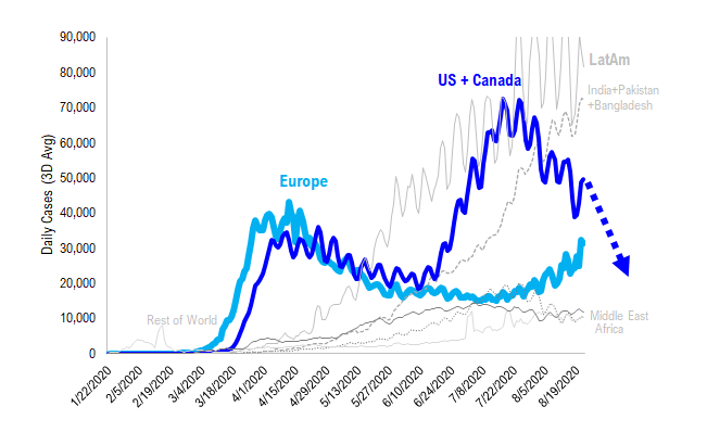 Third, fatality levels remain extremely low in Europe and have not seen a commensurate surge as more cases are in young people, are asymptomatic (and being identified via more testing), and due to better treatments. (For more on this, see this Bloomberg article: Europe's Virus Surge Is Looking Less Deadly Than Initial Wave)
