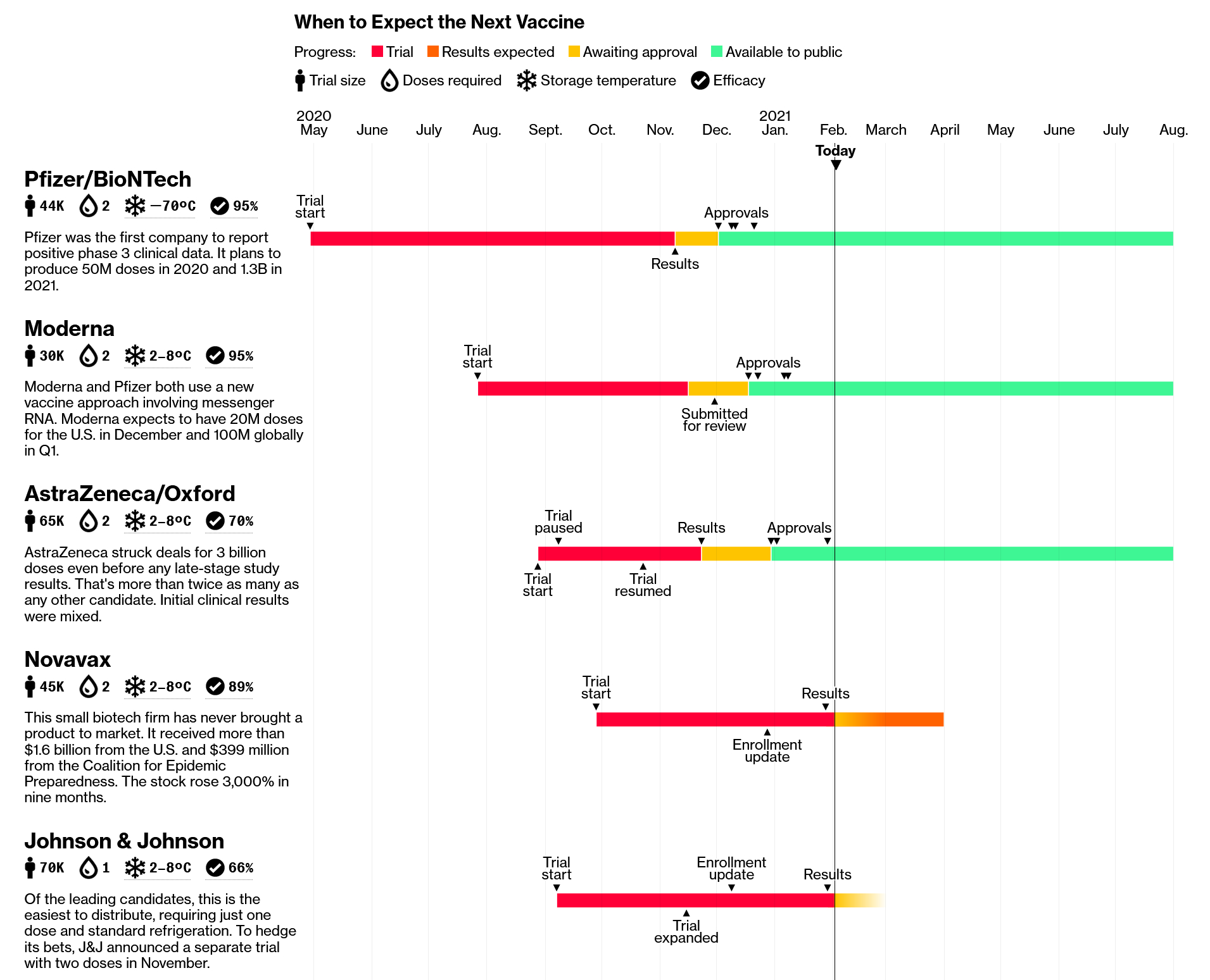 2) There are now three approved vaccines with two more nearing approval (not counting four Chinese and Russian ones, one of which just reported 91.6% efficacy) – here's a summary (source):