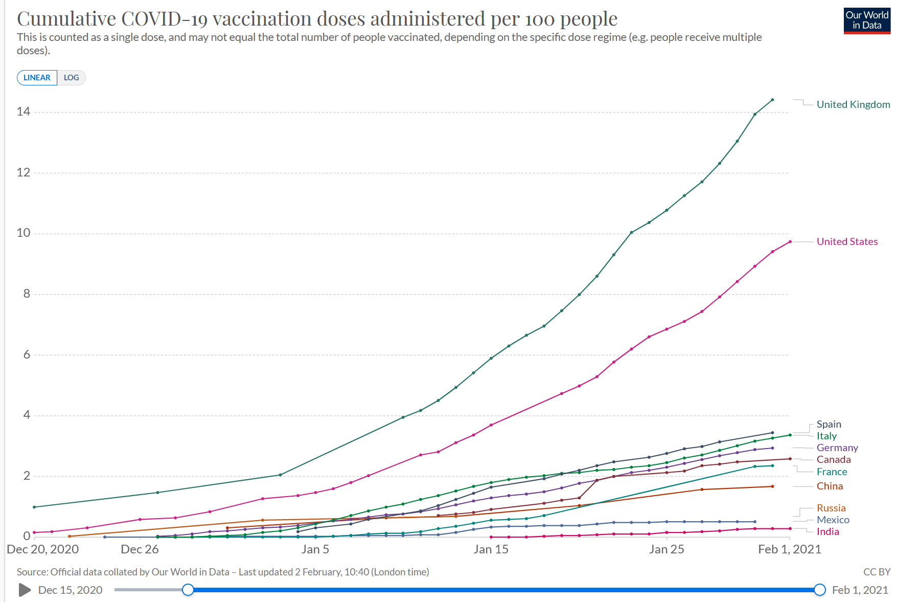 We continue to be among the world leaders in vaccinating our population, trailing only the U.K. among major countries (though every country should be looking to see what Israel is doing – they're at 56%!) (source):