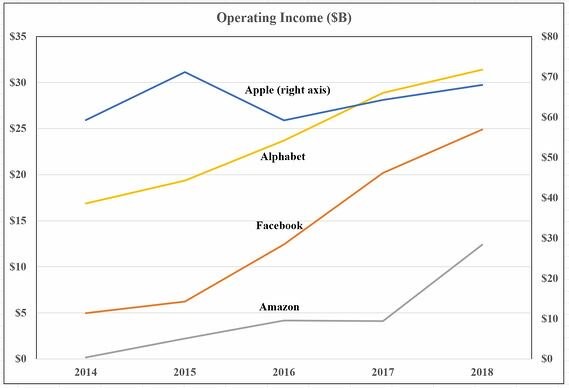 While tech stocks are often driven by revenue growth, eventually it's profits that matter – and in this area, Apple reigns supreme as the most profitable business on the planet, with 2018 operating income nearly matching Alphabet, Facebook and Amazon combined.
