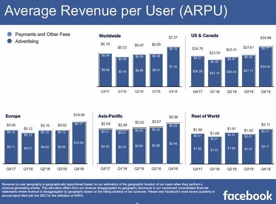 2. Facebook's earnings were especially strong. This is the chart I follow most closely (from the earnings deck), which shows how the company is rapidly increasing its monetization of its users in every part of the world: