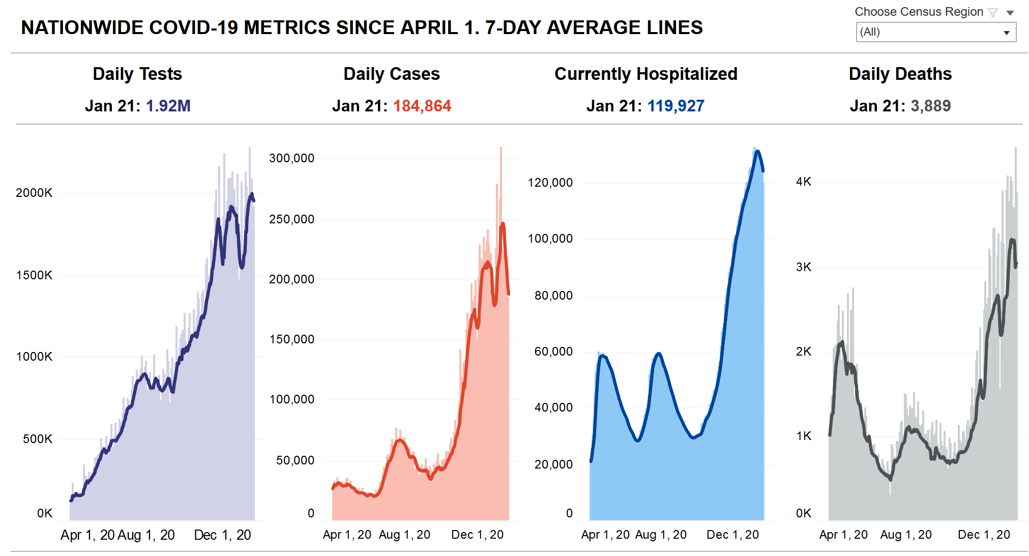 I believe that we will soon be doing 4 million to 5 million vaccinations per day, meaning that most of the U.S. will be vaccinated by April. This will accelerate the collapse of the pandemic, which would have happened anyways due to population immunity (vaccinations will save lots of lives, however, as many people would have died even as the pandemic receded, and the vaccines will cause the pandemic to dissipate much faster).