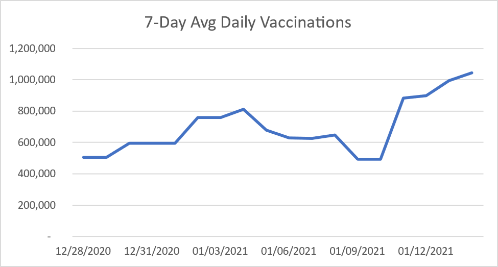 And the number of vaccinations given per day is rising rapidly and just exceeded one million (source), as you can see in this chart:
