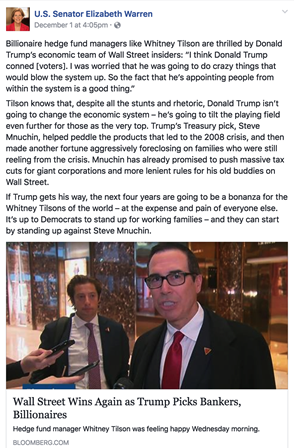 I worried about a tendency to shoot from the hip when Warren misread an article and in 2016 wrote a Facebook rant denouncing a supposedly greedy Trump-supporting investor, Whitney Tilson. In fact: Tilson opposed Trump and agrees with Warren on most issues; indeed, Tilson had previously donated to Warren.