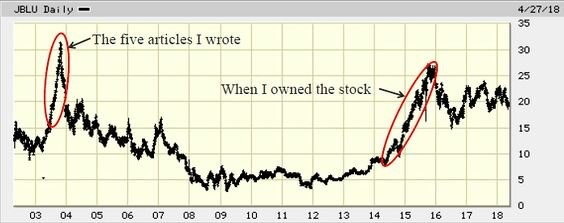 In 2003, a year after JetBlue went public, I wrote five articles about it, which I've posted here. I didn't invest in the stock then, thankfully, as it was a complete dog for more than a decade, but it positioned me well to take advantage when the opportunity arose, as you can see in this chart: