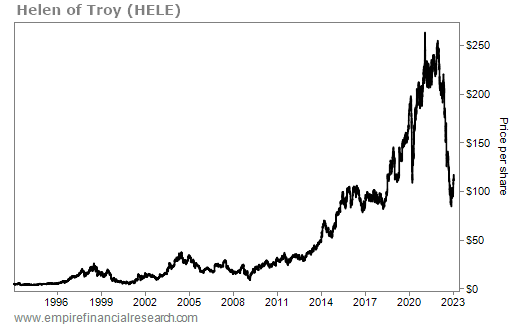 The company has been around since 1968 and, as you can see from the 30-year stock chart below, HELE shares have had a wild ride: from $4 to nearly $30 from 1995 to 1998, then down to $5 in 2001, back to above $30 in 2004, back down to $10 during the global financial crisis, and then an enormous run up to $254 just over a year ago – but then they tumbled to a low of under $90 in October and closed yesterday at $111.50: