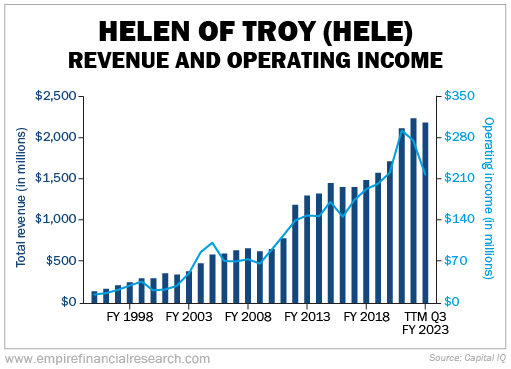 As you can see in this chart of the company's revenue and operating income since 1994, Helen of Troy has been an incredible growth story: