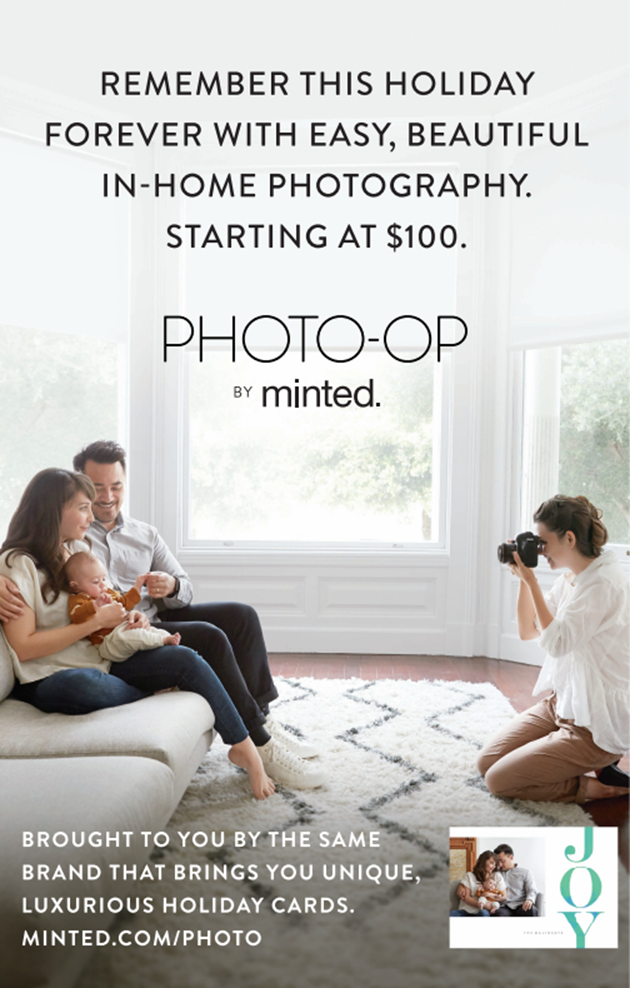 Minted will send a professional photographer to your home (or anywhere you want), any day of the week, for a 30-minute photo session. You'll then receive 10 expertly retouched photos, access to view and download all photos from your session, and complimentary styling of five holiday cards, all for only $100.